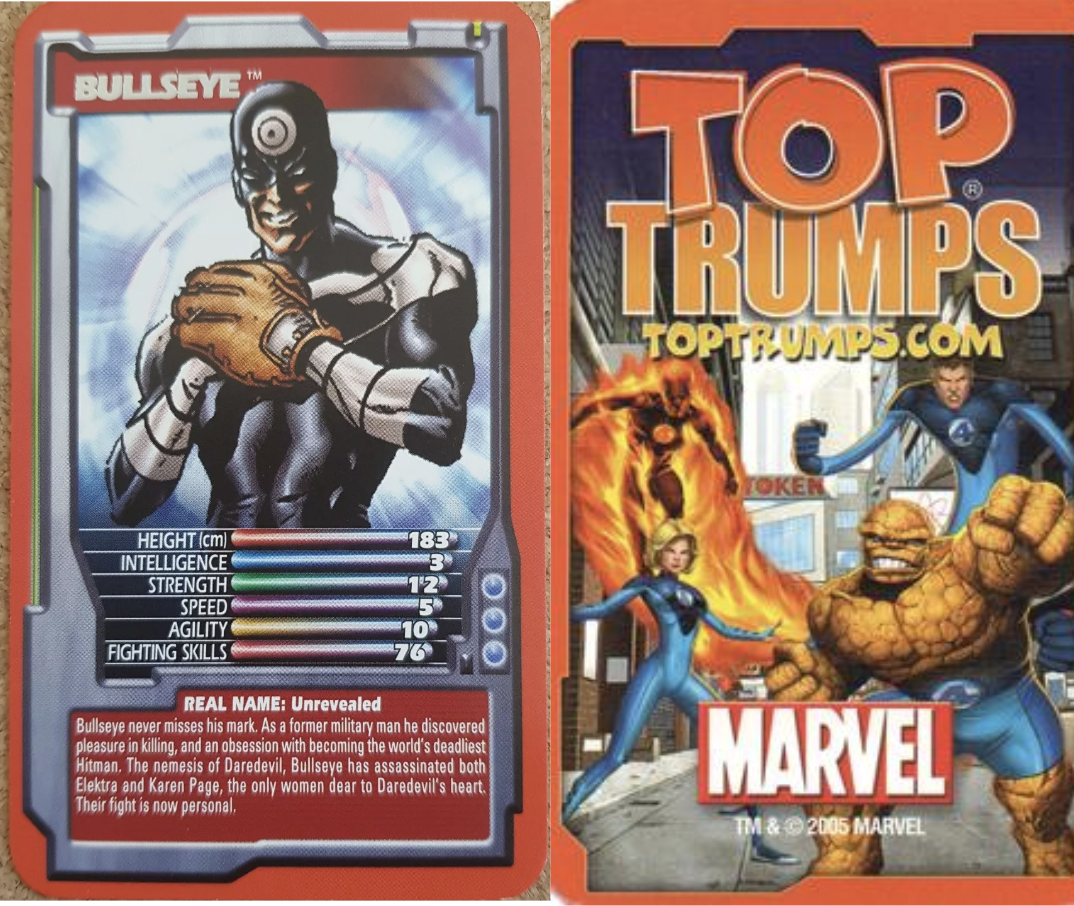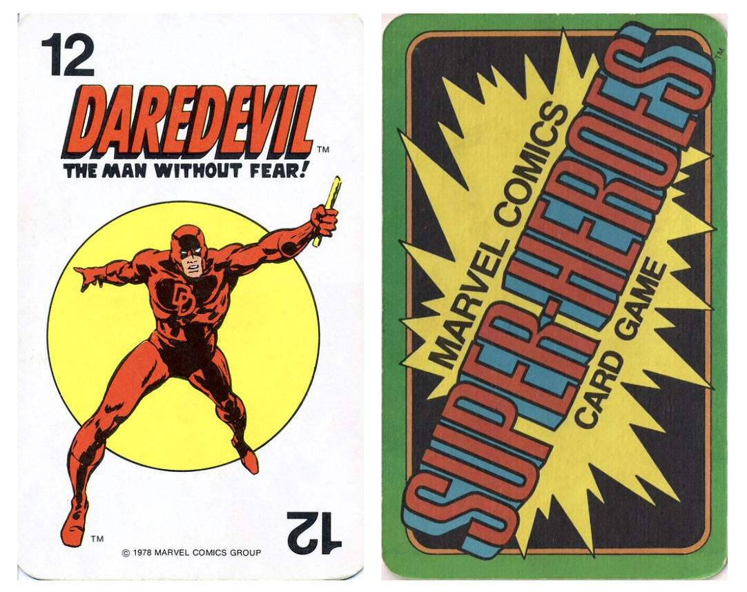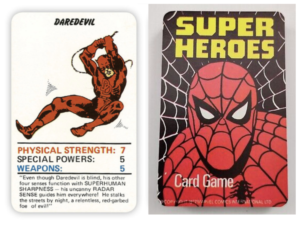 This is a from a Top Trumps-style card game, where the aim is to beat out other players score with a higher number. The card reads “Even though Daredevil is blind, his other four senses function with SUPERHUMAN SHARPNESS - his uncanny RADAR SENSE guides him everywhere! He stalks the streets by night, a relentless, red-garbed foe of evil!”