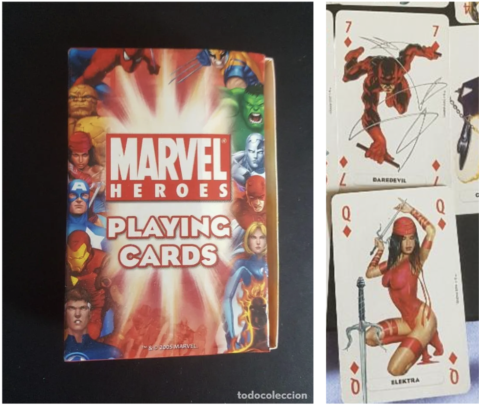 This set of cards includes a Daredevil - the 7 of diamonds - and an Elektra - the queen of diamonds.
