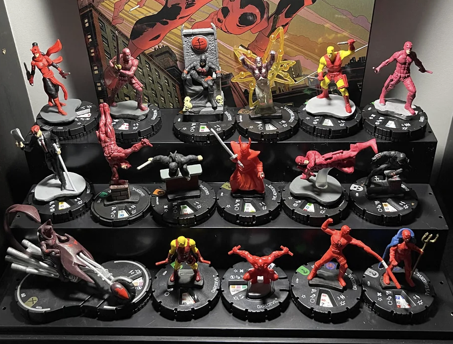 Heroclix is a tactical combat game that features pre-painted miniatures. There are a lot of Daredevil Heroclix, including Elektra as DD, yellow suit DD, Matt Murdock, black suit Netflix DD, Shadowland DD, classic Elektra, Bullseye, Typhoid Mary, Kingpin, Foggy, Karen, Hand Ninjas and various What-If versions. Photo from HiddenRiot (Reddit).