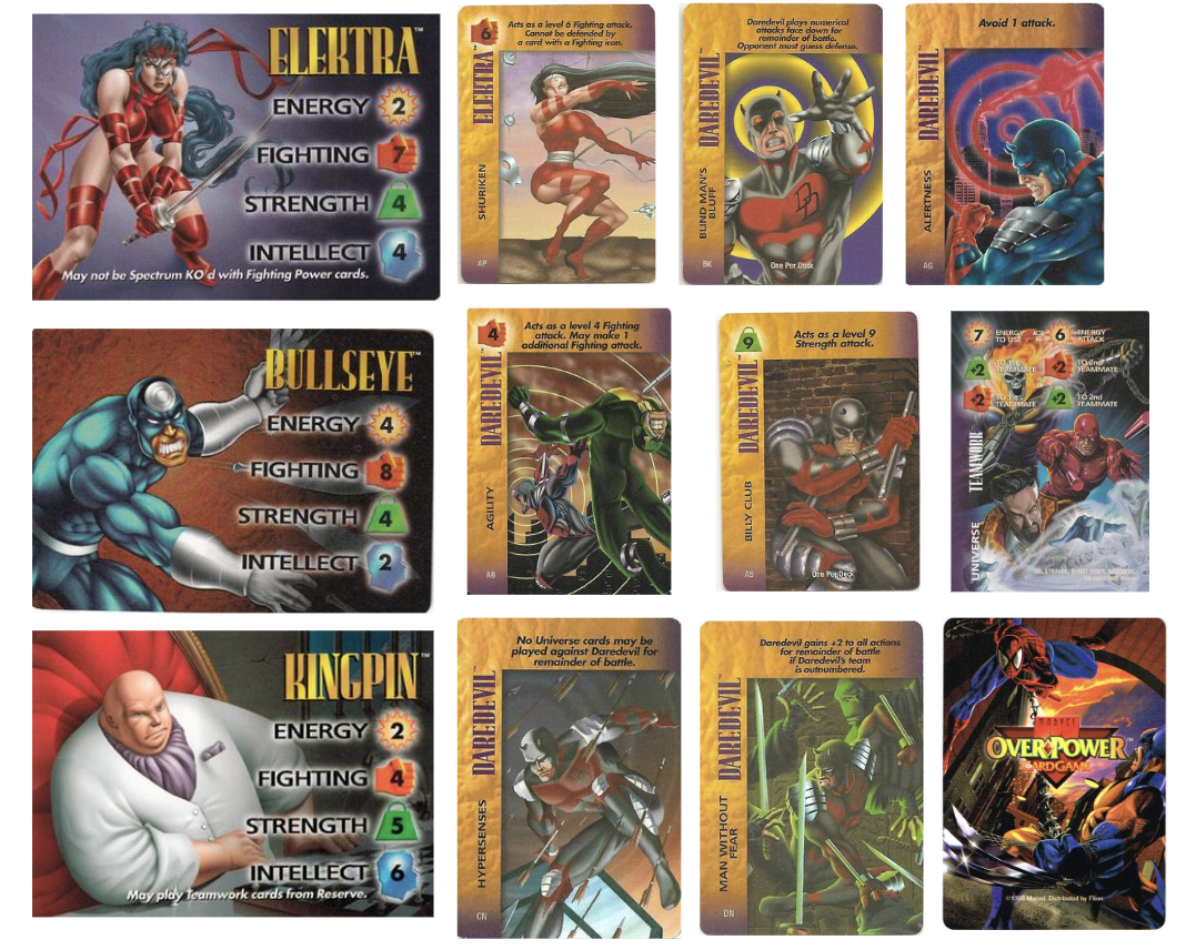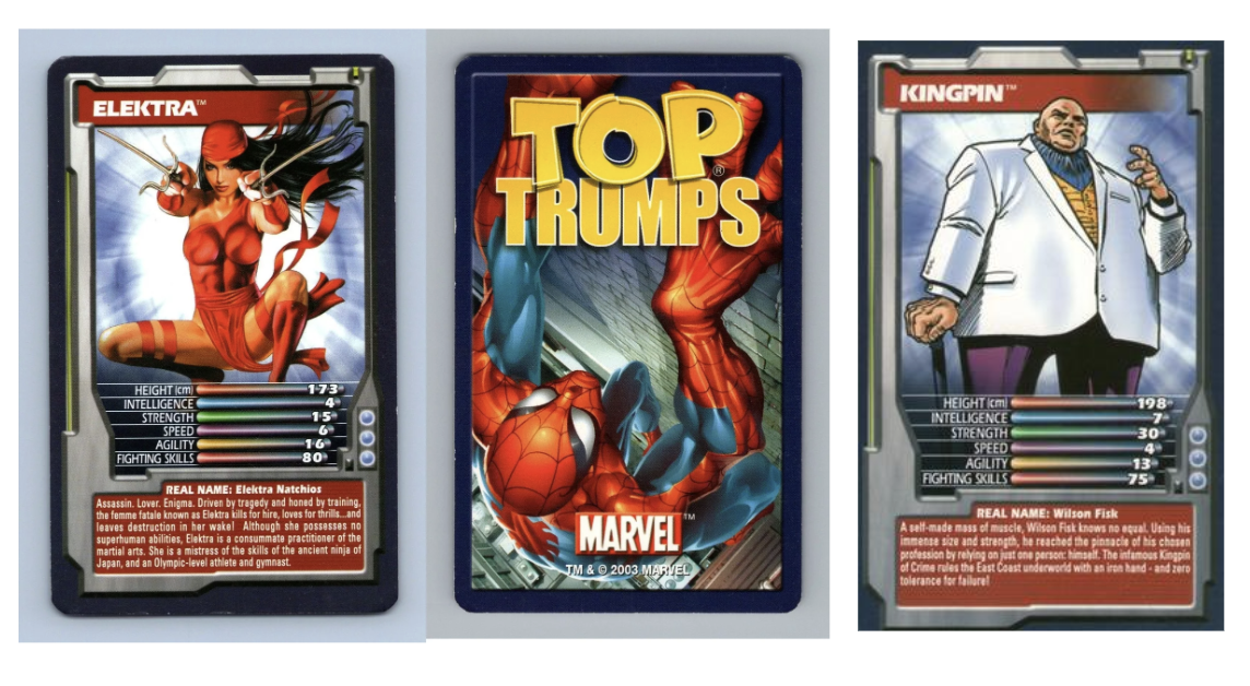 This game involves comparing lists of numerical data on each card and trying to win by having the highest (or sometimes lowest) score on a certain one. Elektra and Kingpin were included in this set.