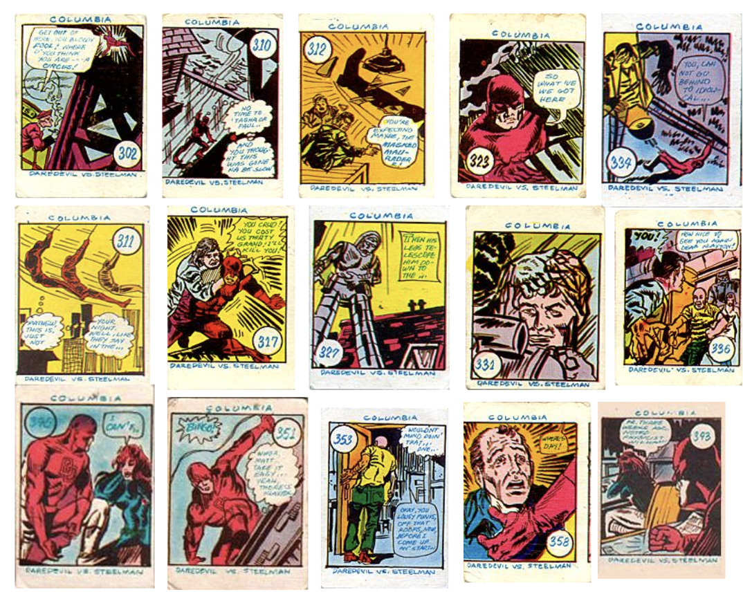 Teks is a card game from the Philippines that involves throwing the cards onto the ground and making bets as to whether a card will land face up or face down. The cards feature many different tie-ins, including Marvel, DC and Muppets. I am not sure on the origin of these particular cards or how many Daredevil ones were made. Despite many different characters being shown, they all seem to be labelled ‘Daredevil Vs Steelman’ (Stiltman?).