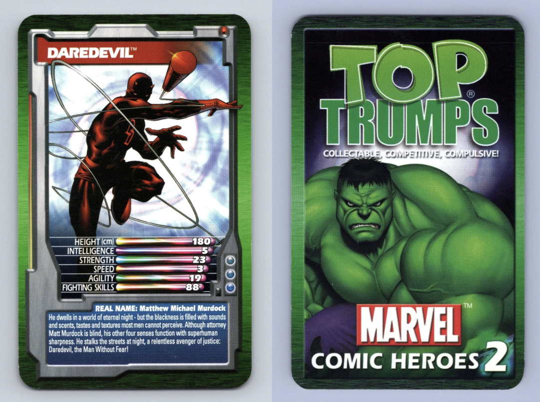This is the second Marvel top trumps game from 2003 and includes a Daredevil card.
