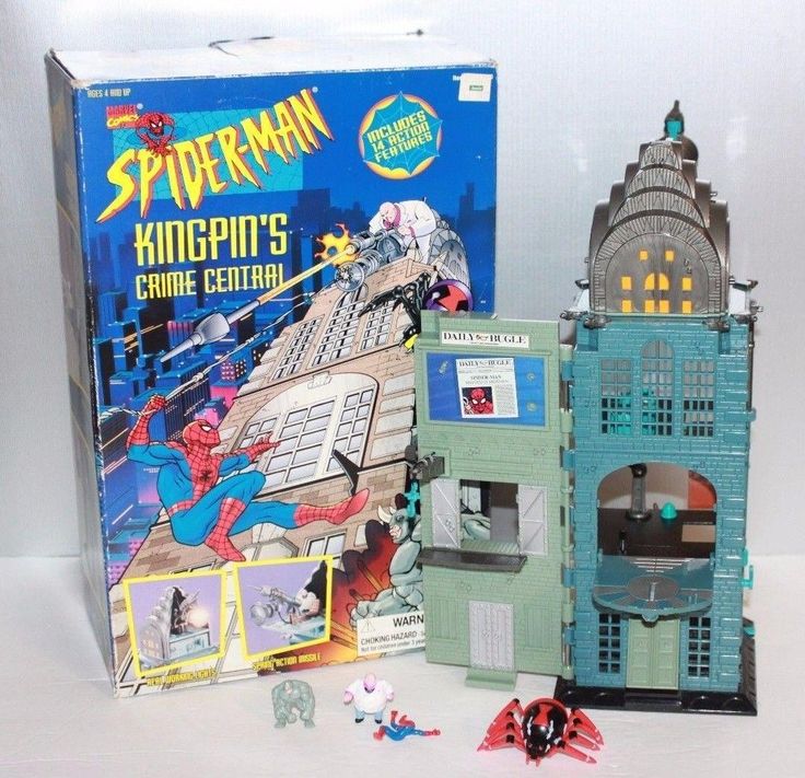 This is from a line of Spider-Man micro playsets like Polly Pocket, which featured sculpted exteriors and miniature scenes inside inspired by episodes of the animated series. This is the largest set in the line and features various different areas like a Daily Bugle exterior, the Chrysler building and Kingpin’s office. There are 4 miniature figurines that come with the set, including a Kingpin one.