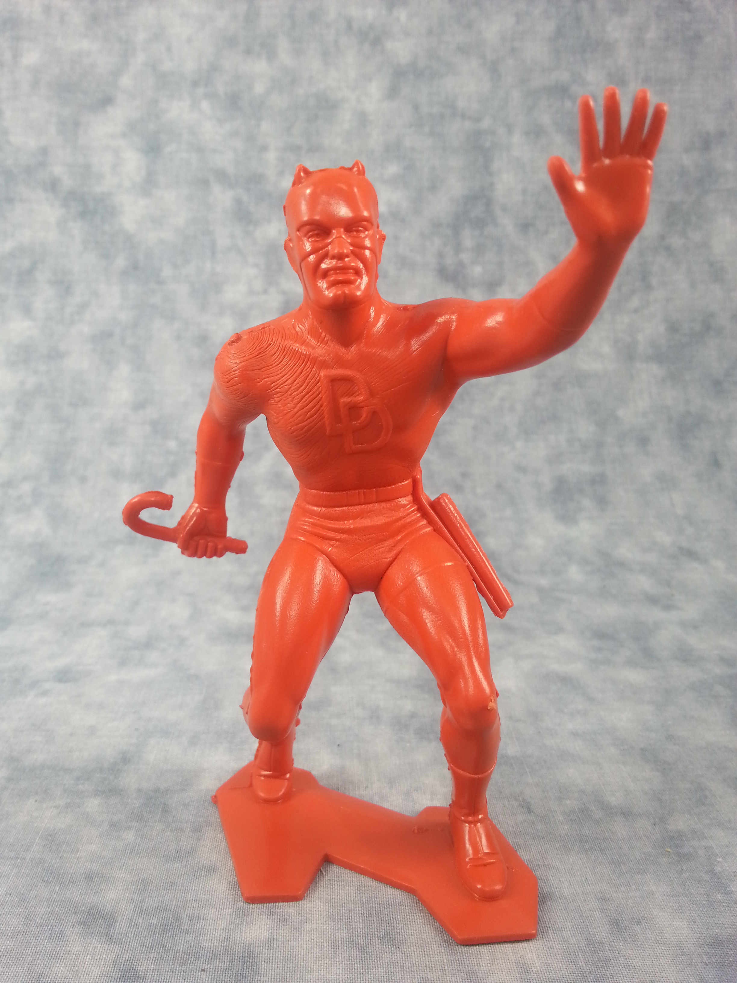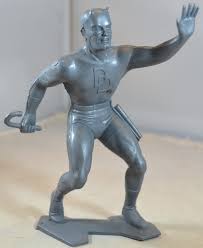 These figures came in different solid colours including red, grey and silver. The line included Daredevil, Spider-Man, Captain America, Iron Man, Thor and Hulk. Due to these being a cheap kid’s toy, they are often damaged, with Daredevil’s billy club often missing. Some collectors (or kids) paint these to match the characters actual colours, but they came completely blank.