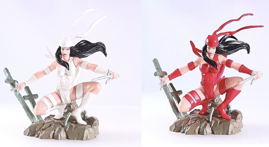 This is a small plastic figurine that came from gashapon (gacha) toy machines in Japan. It came in pieces that required assembly. There were two colourways available for Elektra and she is posed with her sais on a graveyard base. I suspect this figure and the above Daredevil figure were from the same line.