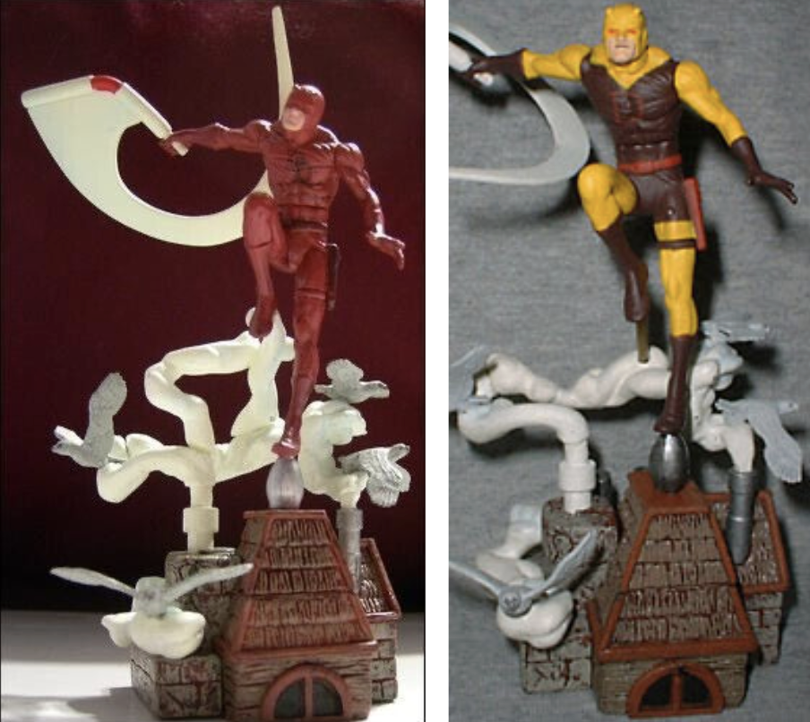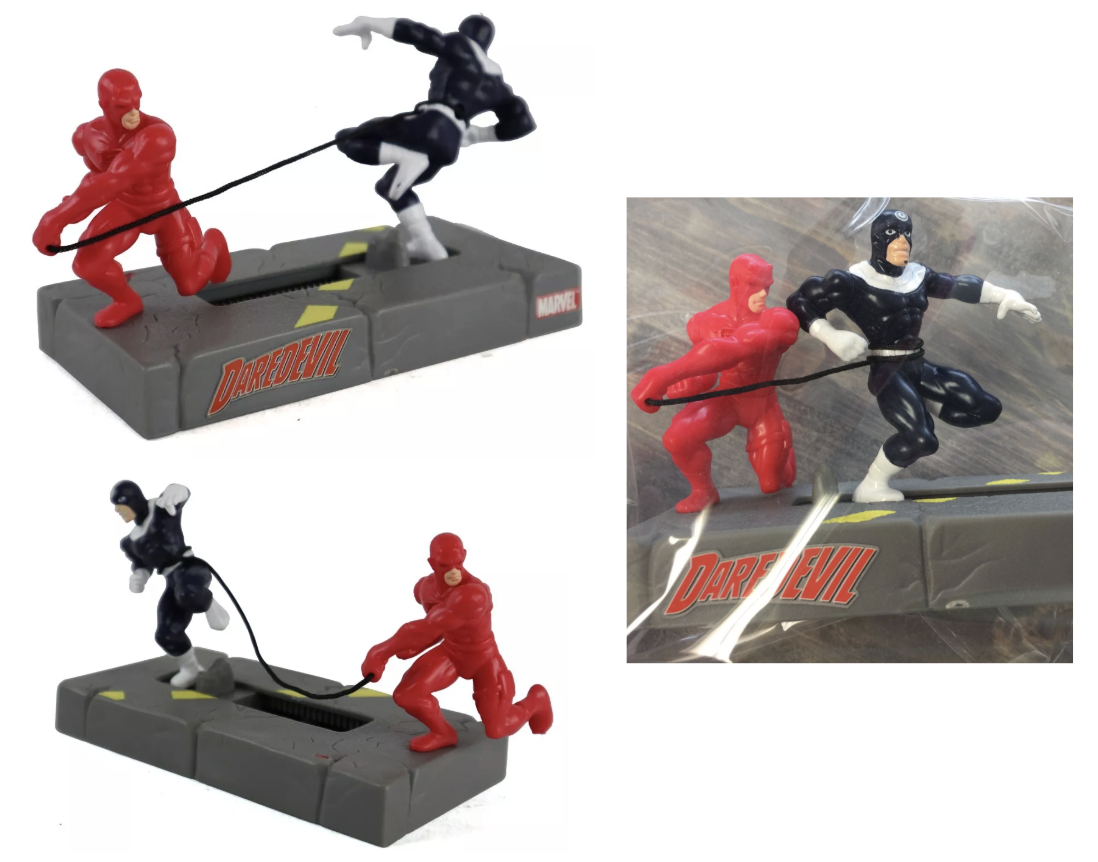 This is a plastic cake decoration featuring Daredevil and Bullseye fighting with the Daredevil logo on the side. I believe Bullseye moved along the base.