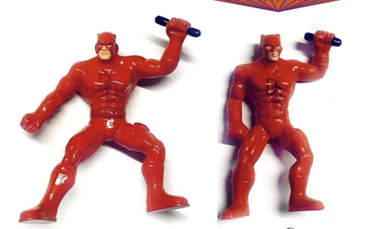These came packaged disassembled in plastic boxes that looked like wooden crates and were designed to feel like you were building your own figure. Daredevil apparently came with 26 separate pieces. There were both red and yellow variants.