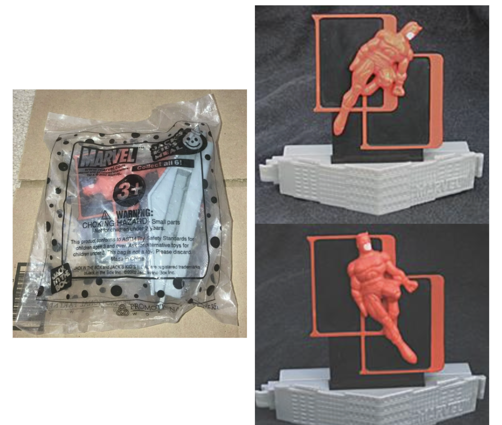 These Burger King kid’s meals had a Bratz Doll and a Marvel option. The Daredevil toy hangs from a string and can be pulled down at which point he goes back up again. There were also Hulk and Iron Man toys available.